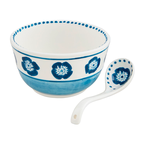 This hand-stamped stoneware salsa bowl with hand-painted details and coordinating ladle will serve up your salsa for game days, parties and Cinco de Mayo!