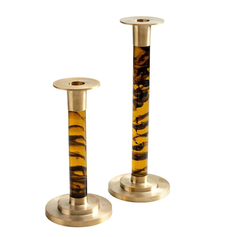 An ideal style between casual and elegant, our resin and brass candlesticks are designed to elevate tablescapes and home décor alike during any season. The natural resin and brass tones give them a versatile neutrality perfect for pairing with any color of taper candle.