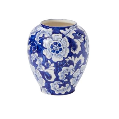 A modern, functional take on classic chinoiserie, the large-scale, intricately hand painted Elodie Vase is a seamless blend of old and new with elegant blue floral patterns on white stoneware. Inspired by a classic ginger jar & designed to support large arrangements, this on-trend vessel provides a vintage sensibility & makes a statement.