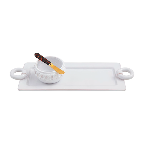 This glazed terracotta tray with side ring handles comes with a coordinating tidbit dish with and a brass finished spreader with tortoise acrylic handle. This set is perfect for serving dip with crackers or crudites.
