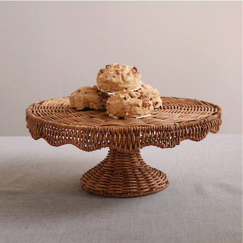 Crafted to hold a round cake, it also provides a stage for scones, petit fours and other goodies. The classic shape is tightly woven of natural rattan over a sturdy wire frame and finished with decorative scalloped edge along the bottom.