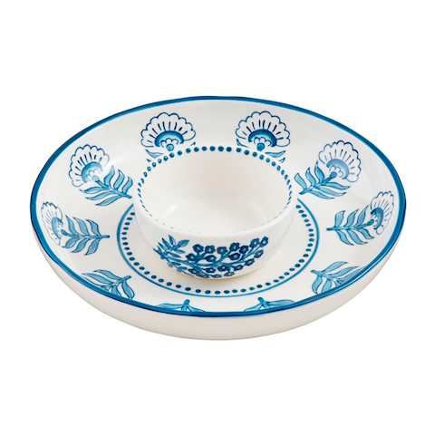 This classic blue & white set has a fun floral pattern and consists of coordinating chip and dip bowls. It is a nice size for veggies, crackers, chips and your favorite dip.