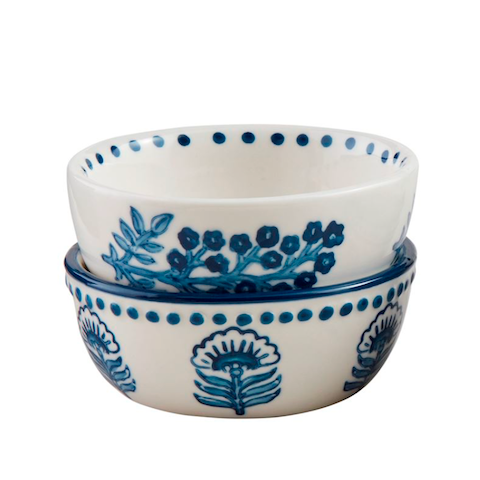 Set of two hand-stamped tidbit bowls with hand-painted rims available in two different patterned sets. You will reach for these all the time for serving dips, toppings, sauces, nuts and candies.