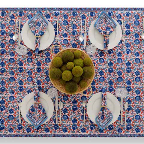 This Bohemian Floral Blues & Paprika print is perfect for warming up a winter tablescape. Blue hues are punctuated by a vibrant shade of paprika red in this lively and colorful print. Pair with matching napkins.