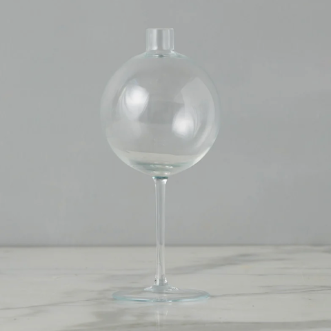This one-of-its-kind Wine Glass Vase adds romantic charm and timeless elegance to any setting. The unique design features a glass sphere perched atop a wine glass stem, diversifying it from a traditional flower vase. This striking vessel looks beautiful styled solo but is best displayed en masse as a table centerpiece. Perfect for wedding arrangements, bridal showers or evening dinner parties, the Wine Glass Vase is sure to make a statement.