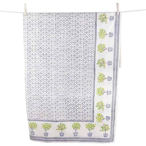 Lemon Trees tucked in blue chinoiserie planters were hand painted to create a classic palette of tonal blues, yellows and greens that bring this print to life. Our Lemon Topiary Tablecloth is a staple to any kitchen or dining table for warm-weather entertaining. Hand block printed.