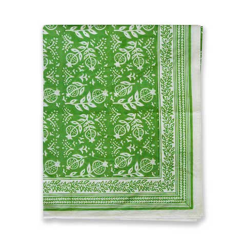 This vibrant green tablecloth is decorated with a distinctive, hand-painted pomegranate surrounded by lively fleurettes and a complementary border and makes a great foundation piece for indoor or outdoor entertaining.
