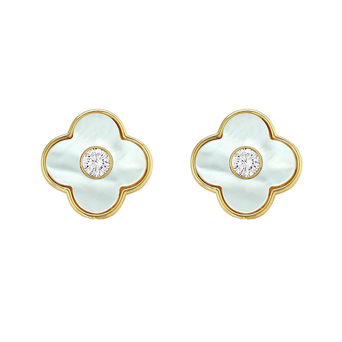 14k gold dipped Angelina clover studs with mother of pearl & CZ center.