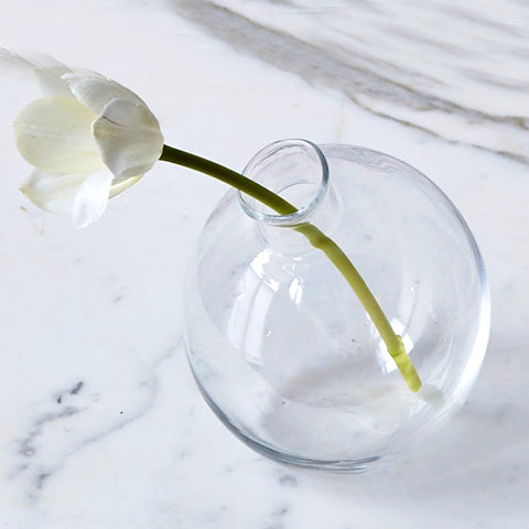 This hand-blown round bud vase can be used for a single sprig of your favorite flower or, for a more contemporary application, fill it with candies or nuts, add a bow and you have the perfect hostess gift!
