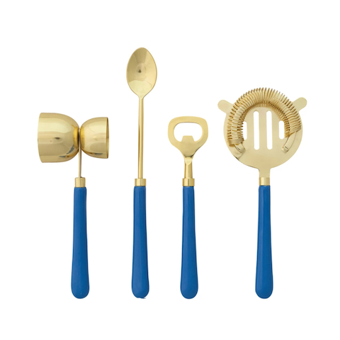 This fun bright blue and gold set of bar tools will add some zip to your everyday cocktail prep. They also make a great gift. Includes a jigger, cocktail spoon, bottle opener and cocktail strainer.
