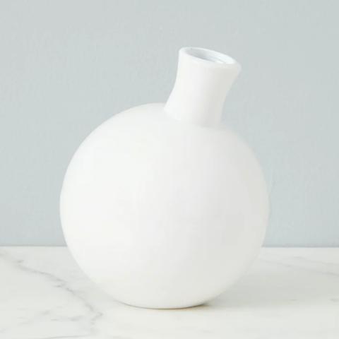 The Sphere Bud Vase is mouth-blown by European artisans and designed to sit slightly off center on your tabletop. A sleek coffee table accent or shelf styler, this sphere vase is elegantly imperfect due to the recycled nature of the glass. The vase features a sleek, high-gloss white finish. Easily display single stem greenery or fresh cut flowers in this unique vessel.