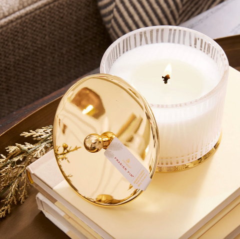 Accented with a glistening gold lid and gilded gold base, this elegant and luminous frosted wood grain candle is the perfect way to experience Frasier Fir.
