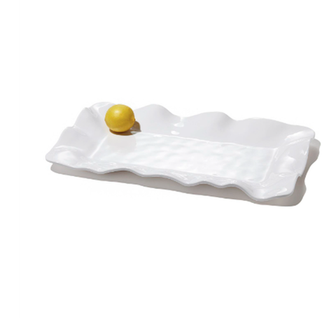 Featuring flirty curves, and an opulent surface our Havana White Long Rectangular Tray is rendered in luxury melamine. With the substance, weight, and appearance of a kiln-fired ceramic piece, this handy and handsome long melamine platter is designed for everyday enjoyment, perfectly suited for indoor and outdoor entertainment. Ideal for serving bread and cheeses, you may pair the platter with our other white melamine pieces for a coordinated serving set.
