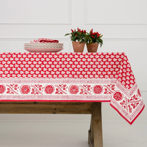 Set the stage for memorable gatherings with our Pom Buti Red Tablecloth. This captivating design is destined to become the centerpiece of your dining experience, infusing your space with a warm and inviting atmosphere. The rich red fabric, adorned with elegant white florals, sets the perfect tone for any occasion, whether you're hosting an intimate dinner party or a grand celebration. Its versatility shines throughout the year, effortlessly adapting to the changing seasons. Let the Pom Buti Red Tablecloth be the canvas upon which your cherished moments unfold, where every meal is enhanced by the allure of its timeless beauty.