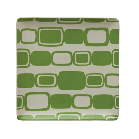 This bright geometric patterned plate in apple green and white will add a fun pop of color to your kitchen or dining table. Use it on your counter to display fruit or as a serving piece at dinner.